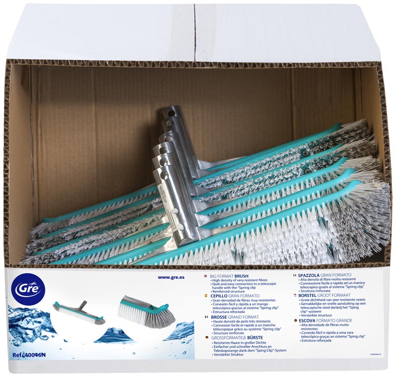 Los cepillos de GRE permiten limpiar en profundidad las piscinas desmontables y enterradas tanto el fondo como las paredes. Los cepillos de la gama de GRE están diseñados con un sistema de fijación (sistema clip o palomillas) para conectar con un mango telescópico lo que permite limpiar la superficie de toda una piscina sin tener que desplazarse mucho. Estos cepillos están disponibles en varios tamaños colores o materiales para cubrir todas las necesidades de limpieza de la piscina.