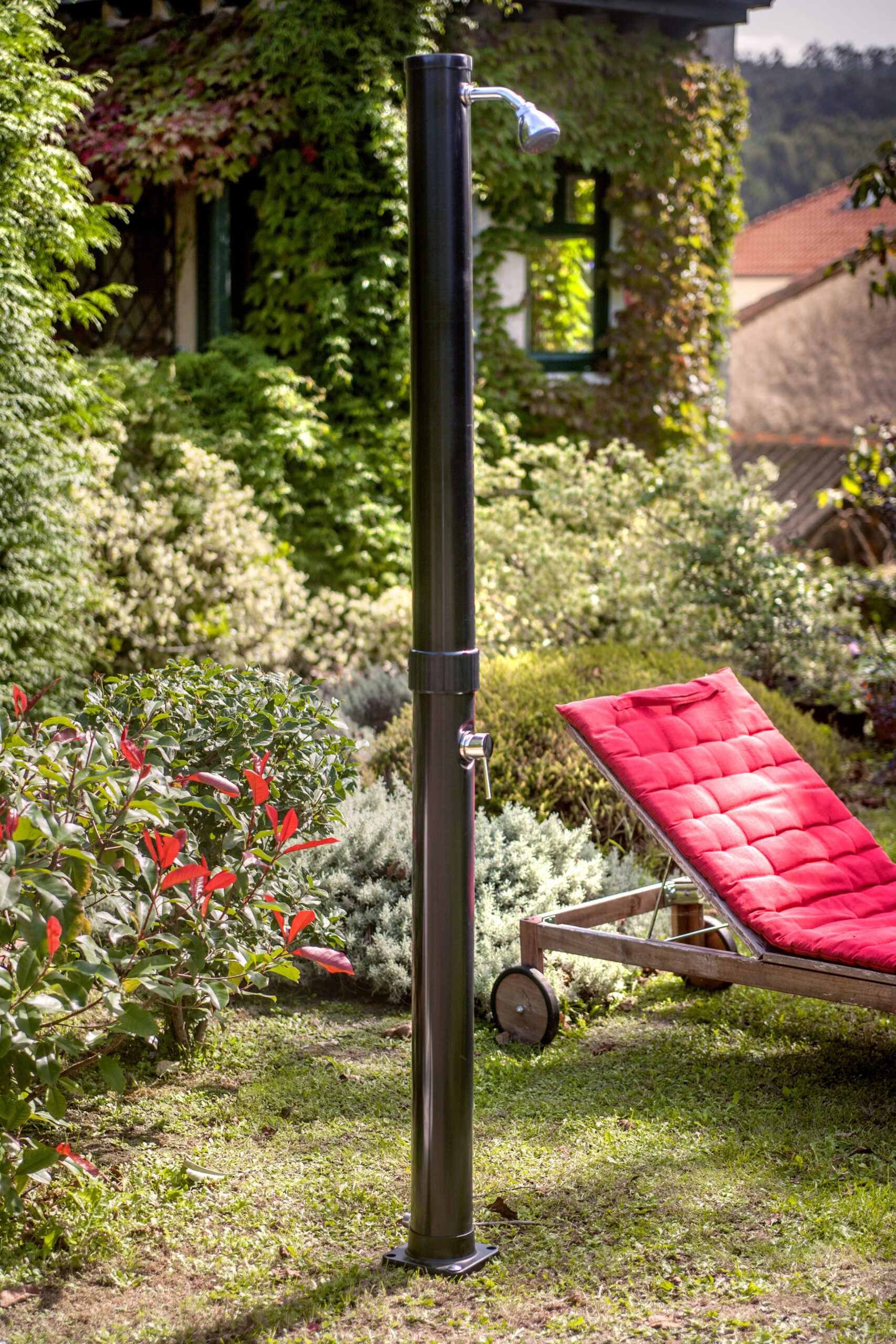 La instalación de una ducha solar en el jardín o en los alrededores de la piscina es muy sencilla y permite disfrutar de agua caliente gratuita y de forma rápida.Las duchas solares calientan el agua gracias a la energía solar y no consumen electricidad. Se instalan en el jardín en la terraza o cerca de la piscina y sólo necesita estar conectada a una manguera con acceso al agua. GRE propone una amplia gama de duchas solares de distintos colores con lavapiés o sin y con un tanques que van desde los 20 litros hasta los 35 litros.