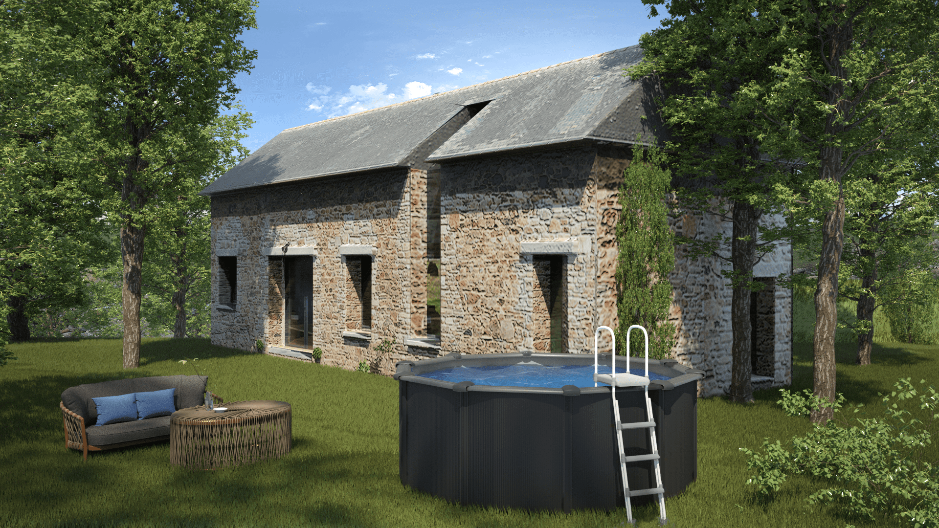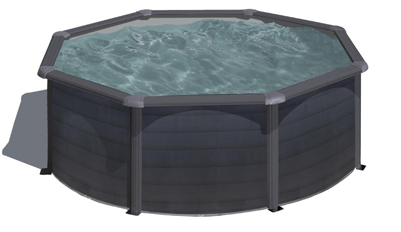 Piscina redonda de pared de acero con decoración de grafito, Medida comercial: Ø350 x ↕120 cm, Referencia: KIT350GF, Medida exterior: Ø370 x 122 cm, Medida interior: Ø350 x 120 cm, Volumen de agua: 10,10 m³, Liner de PVC gris con tratamiento anti-UV – espesor del liner: 30/100, Depuradora de arena con un caudal de 4 m³/h. Incluye la arena sílex (±20 kg). Nuestros filtros están conformes a la norma Europea, Escalera de seguridad tipo tijera de 2×3 peldaños. Permite desmontar los peldaños de un lado para impedir el acceso de los niños a la piscina y prevenir accidentes. Conforme a la norma Europea, Estructura del vaso y perfilería de acero galvanizado, Protectores de inyección para las uniones entre los perfiles horizontales, Incluye conjunto de skimmer, Incluye mangueras de conexión, La estructura metálica cuenta con una garantía de 5 años, Resto de componentes tiene una garantía de 2 años (Salvo ampliación de garantía dependiendo del país), Tiempo de instalación de piscinas: entre 2-3 personas una duración de 2 horas, Piscina sobresuelo, Solera de hormigón opcional