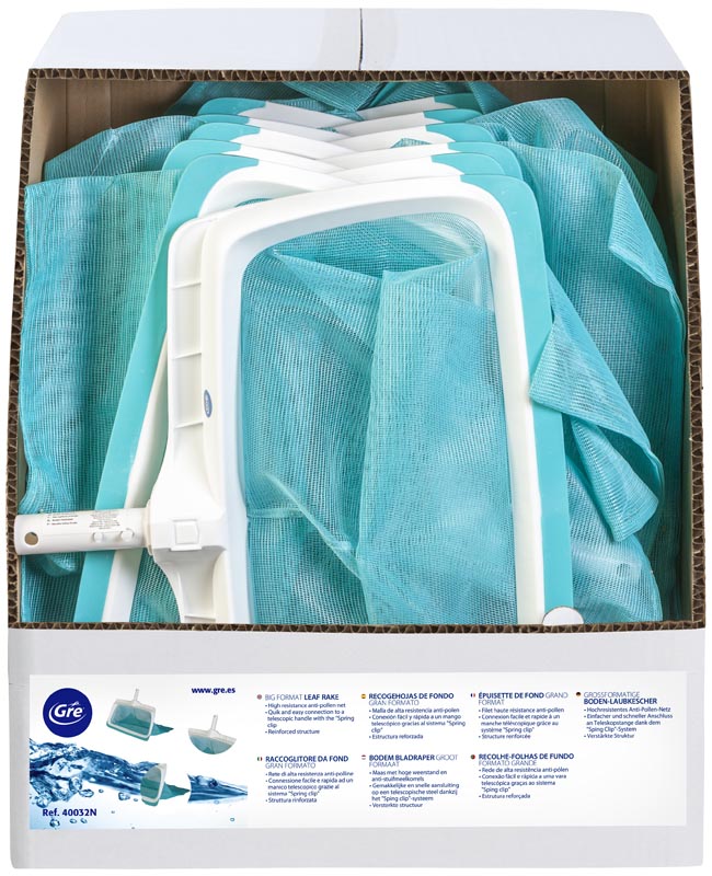 Los recogehojas de fondo permiten recoger los residuos que se han quedado en el fondo de la piscina como las hojas los insectos o las partículas más pequeñas. Los recogehojas de fondo de la gama de GRE están diseñados con un sistema de fijación para conectar con un mango telescópico lo que permite limpiar la superficie de toda una piscina sin tener que desplazarse mucho. GRE ofrece una amplia gama de recogehojas de fondo de distintos materiales y colores que se adapta a todas las necesidades de la limpieza de la piscina.