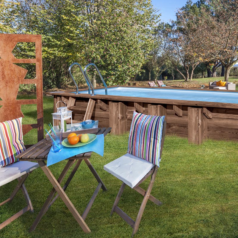 Piscina de madera rectangular fabricada en Francia en pino silvestre Francés, Medida comercial: 618 x 320 x ↕130 cm, Sistema de sujeción: con sistema de omegas, Referencia: KPBRC620 MANGO, Medida exterior: 618 x 320 x 130 cm, Medida interior: 568 x 273 x 127 cm, Volumen de agua: 18,1 m³, Liner de PVC azul con tratamiento anti-UV – espesor del liner: 6075/100, Depuradora de arena con un caudal de 6 m³/h. Incluye la arena sílex (±40 kg), Escalera exterior de madera y escalera interior de acero inoxidable, Protectores de fondo y pared, Estructura de pino silvestre francés y autoclave clase IV. Certificado PEFC, Embellecedores metálicos, Incluye conjunto de skimmer, Incluye mangueras de conexión, Estructura cuenta con una garantía de 10 años, Resto de componentes tiene una garantía de 2 años, Múltiples posibilidades de Instalación: elevada sobresuelo semienterrar o enterrar completamente, Losa de hormigón: opcional con unas dimensiones de 718 x 421 x H15 cm (4,55m³)